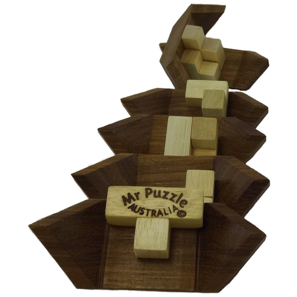Two of the most popular puzzles ever made and sold in the world have been used to make this unique puzzle. The puzzle is to assemble both the Soma Cube and the six piece diagonal burr at the same time.